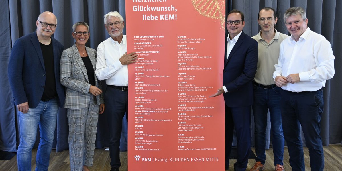 Sportlich, sportlich – sowohl die Zahl der KEM-Jubiläen als auch der Ort, an dem vor wenigen Tagen gefeiert wurde – das Fußballstadion Rot-Weiss Essen. Marion Greve, Superintendentin des Kirchenkreises Essen, und Thomas Kufen, Oberbürgermeister der Stadt Essen, gratulierten und freuten sich mit den Gästen und Mitarbeitern der KEM an einem der 5 führenden Gesundheitsstandorte in Deutschland zu arbeiten.